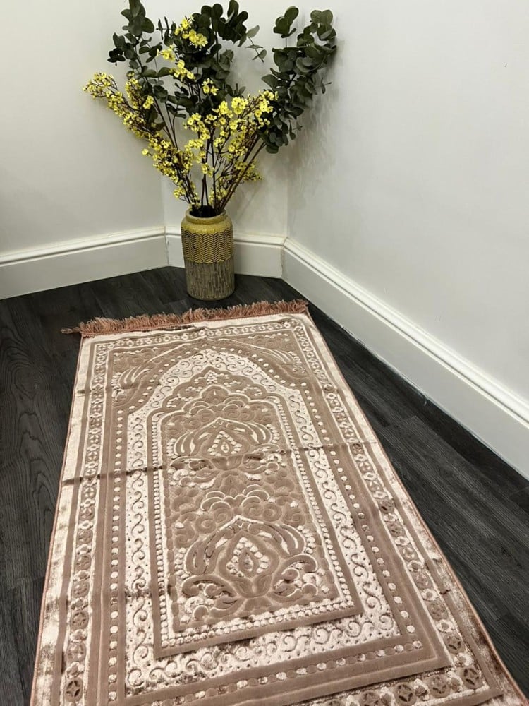 سجادة صلاة حرير لحمي هي كل ما تحتاجين إليه لتكملي ركن الصلاة الهادئ الخاص بكِ، وذلك بفضل حجمها الكبير وخامتها المريحة.